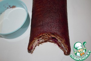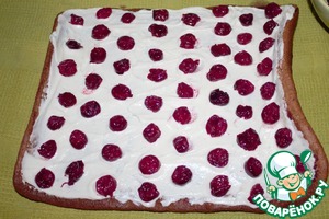 Остывший корж развернуть, внутреннюю сторону пропитать вишневым соком (много не лейте, что бы бисквит не размяк) и смазать 2/3 крема (оставшийся крем убрать в холодильник). На крем выложить вишни. Свернуть в рулет, завернуть в пищевую пленку и убрать в холодильник минимум на 40 минут. В принципе на этом можно остановиться, рулет сам по себе очень вкусный, но, если хочется навести красоту, то продолжим :) Перед тем как убирать в холодильник немного прижмите верхнюю часть рулета, что бы поверхность стала более плоской, так лучше будет держаться декор.