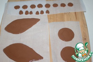 Далее, исходя из размера получившегося рулета, карандашом рисуем на пергаментной бумаге необходимые детали. Что бы было удобнее, можно положить рулет на лист обычной бумаги, обвести карандашом, и нарисовать декор, а затем уже переносить нужные фигуры на пергамент. Лист пергамента положить на разделочную доску, заполнить нарисованные контуры растопленным шоколадом и убрать в холодильник до застывания.