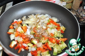 Кладём овощи на горячую сковороду, добавляем соль, смесь перцев, красный жгучий перец, кориандр и зиру, всё перемешиваем. -