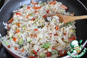 Готовый рис из пакетика кладём на сковороду с овощами.