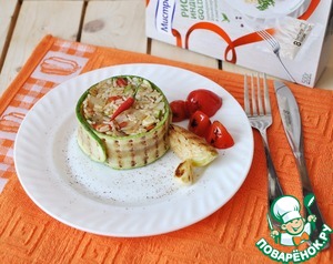 Подаём рис с овощами-гриль сразу горячим. Для подачи я использовала кулинарное кольцо, обернула рис цуккини-гриль, рядом положила овощи-гриль, всё посыпала смесью перцев.