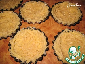 Формочки для тарталеток хорошо смазать маслом и равномерно выложить тертый картофель.