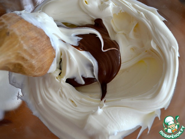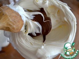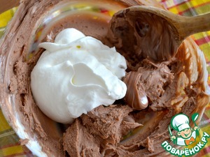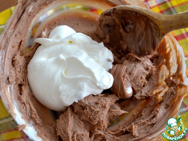К получивщемуся шоколадному крему добавить взбитые сливки. Осторожно все перемешать, сохраняя воздушность крема.