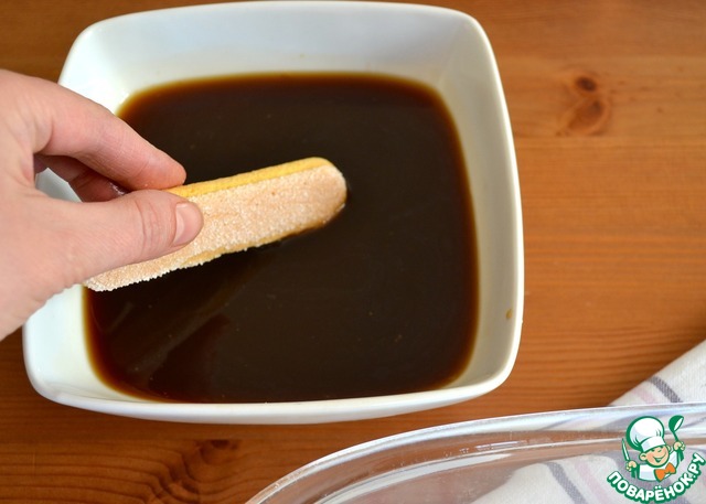 Заранее сварить кофе и остудить. По желанию, можно слегка подсахарить. Подготовить печенье Савоярди. Кстати, если найти такое печенье для Вас не представляется возможным, его можно заменить на тонкий бисквитный корж, приготовленный заранее по Вашему любимому рецепту. После из бисквита вырезать кружочки, соответствующие по размеру стаканам (креманницам), в которых Вы будете подавать десерт! И дальше - все как с печеньем...