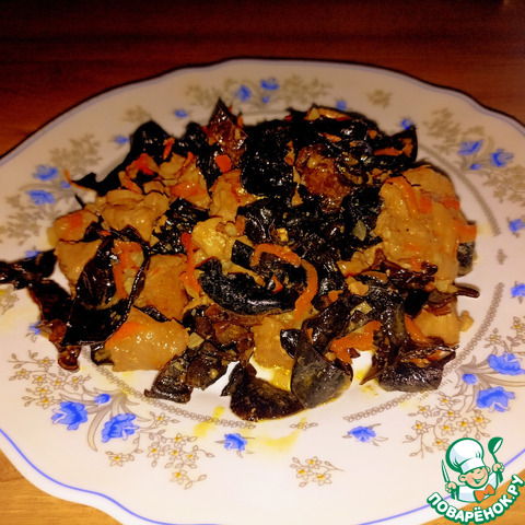 4. В сковороду наливаем растительное масло, выкладываем свинину, немного солим и жарим-тушим до готовности. К готовому мясу добавляем морковь и тушим до готовности моркови. Готовое мясо с морковью перекладываем в блюдо.
