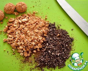 Предварительно порубите на маленькие кусочки шоколад и поломайте печенье (за неимением печенья Амаретти, можно взять любое другое хрустящее печенье или даже поломанное на кусочки безе)