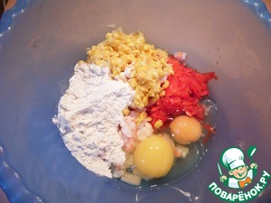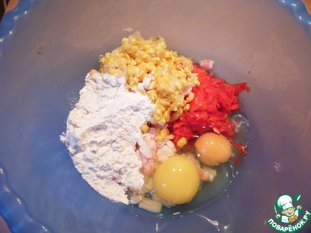 Смешать перец, кукурузу, креветки и лук, добавить яйца и муку, хорошо перемешать.