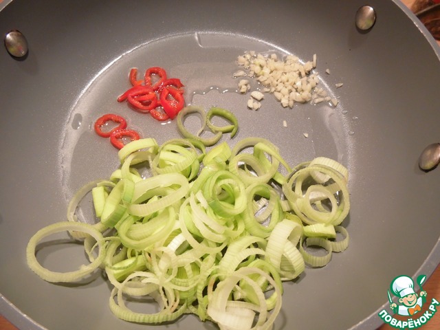 Лук-порей и чили нарезать колечками, чеснок измельчить. Подготовленные продукты обжарить на растительном масле 2 минуты.