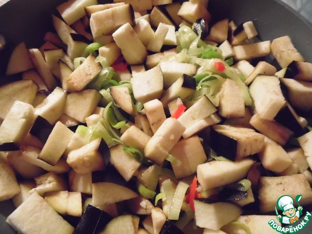 Баклажаны нарезать кубиками, добавить к обжаренным овощам, обжарить 4-5 минут.