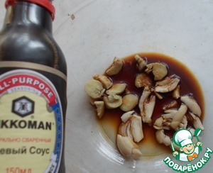 Чеснок раздавить с помощью ножа и смешать с соевым соусом Киккоман и соком лимона.