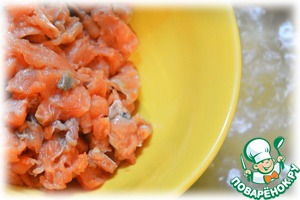 Поставить воду на плиту. Порезать кубиками рыбу и