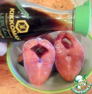 Нарезать горбушу крупными кусками, поперчить и сбрызнуть 1ст. л. ТМ «Киккоман».
