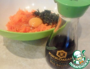 Натереть на мелкой терке морковь, добавить яйцо, укроп, томатную пасту, крахмал и 1ст. л. соевого соуса ТМ «Киккоман». Перемешать.