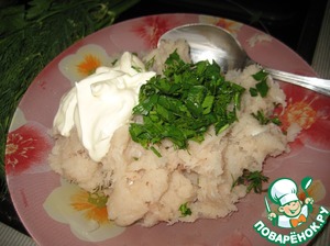 Превращаю её в фарш блендером (отлично с этим справится мясорубка). На выходе имеем примерно 650 г фарша. В рыбный фарш добавляю сметану и зелень, перемешиваю хорошо -