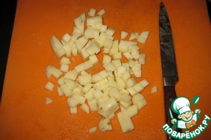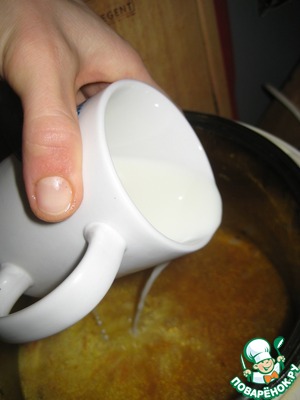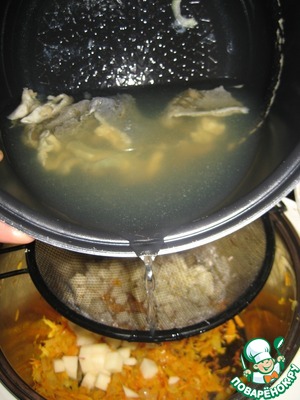 В приготовленный и процеженный бульон добавляю зажарку и картошку