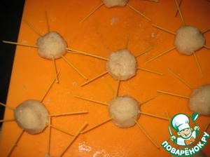 Леплю небольшие фрикадельки, в которые втыкаю сломанные пополам спагетти (у меня вставлено только по 3 штучки, можно больше). Вот так осьминоги!