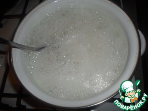 Сахар заливаем водой. Ставим кастрюльку на плиту, доводим до кипения и в таком состоянии держим 3 минуты постоянно помешивая. (Кипятим на маленьком огне).