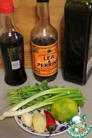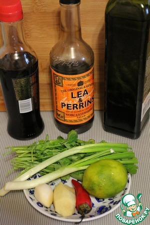 Мелко порезать лук, имбирь, чеснок и кинзу. Положить все в чашу блендера, посолить, добавить сок лайма, соевый и вустерширский соус и пробить блендером. Порезать половину перца чили (ориентируйтесь на свой вкус), добавить к остальным ингредиентам, туда же влить оливковое масло и еще раз быстро пробить блендером.