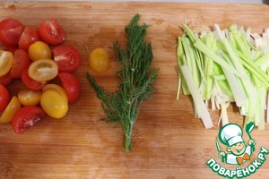 Пока закипает вода, для варки риса, подготовим ингредиенты для запекания рыбы. Лук порей порезать соломкой, помидоры черри - на половинки.