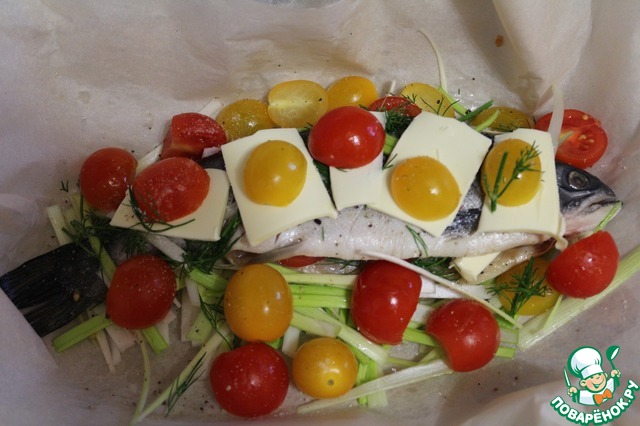 Пергамент сложить в двое и положить на него порезанный лук порей. На рыбе сделать надрезы, посолить, поперчить и выложить на подушку из лука порея. В брюшко рыбы положить кусочки помидора, веточку укропа и несколько кусочков сливочного масла. На рыбу сверху, так же укладываем кусочки сливочного масла, помидоры черри и оставшийся укроп (просто порвать руками). Завернуть рыбу, в плотный конверт из пергамента (в этом отлично поможет степлер), так все соки и аромат останусь внутри. Готовим рыбу в заранее разогретой до 200 градусов духовке, 15-20 минут.
