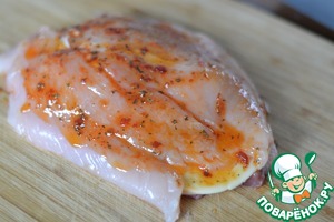 Выкладываем в глубокую сковороду, смазать сверху соусом.