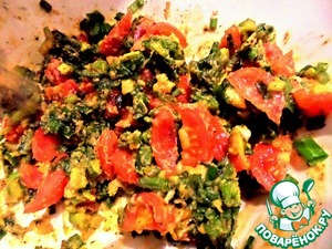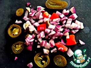 Красный лук, чеснок, черри, базилик, зелёный лук, сладкий перец и пепперони нарезать мелко.