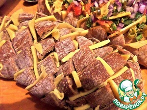 Сверху по возможности затолкать в надрезы начинку или просто выложить сверху.