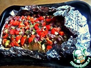 Вначале запекаем, прикрыв фольгой, а потом раскрываем, чтобы запёкся верх.