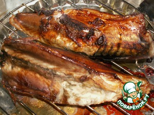 Рыбу помыла, выпотрошила, натeрла солью, специями для рыбы и смазала жидким дымом (коптильный преперат). -