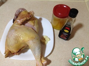 Застилаем фольгой противень или емкость в которой будет печься курица. Хорошо натираем курицу маринадом и сверху и внутри оставляем на 30 минут что-бы она хорошо пропиталась и просолела от соуса.