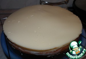 Между пропитанными коржами выкладываем застывшее суфле. Убираем торт в холод.