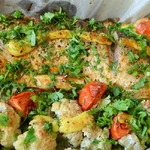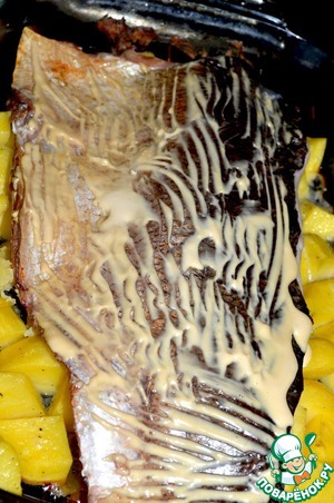 • Филе уложить на картофель кожицей вверх. Запекать в духовку при температуре 200 С 20-30 минут.