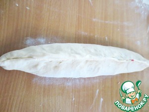 Из одной части раскатать овальную лепешку ( примерно 40-50 см длиной и 15 см шириной)