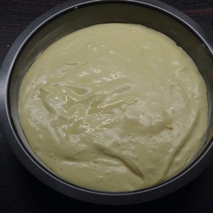 Осторожно переложить получившееся тесто в подготовленную форму. Не разравнивайте и не стучите формой по столу. Можно просто слегка наклонить форму, помогая тесту равномерно распределиться по всей поверхности.