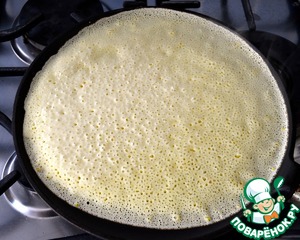 Разогреть сковороду для выпечки блинов и вылить первый половник теста на сковороду. Хочу сказать, что мне очень нравятся эти блины. (Готовлю их теперь часто). Они получаются достаточно плотные и очень ароматные! Зажариваются красиво и равномерно.