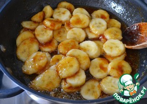 Выложить в сковороду бананы. Осторожно помешивая, очень быстро обжарить их в карамели, не более 1 минуты, иначе они развалятся. Снять сразу же с огня и отставить в сторону.