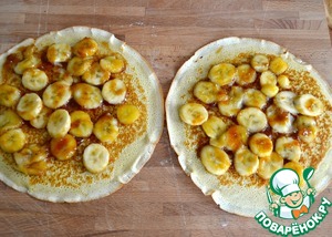 Займемся сборкой торта. На рабочую поверхность положить два блина. На каждый блин выложить бананы в карамели и распределить по всей поверхности блинов.