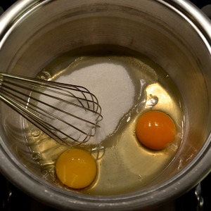 Смешайте яйца и сахар в небольшой кастрюльке с толстым дном.