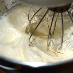 Затем добавить остальные сливки и очень аккуратно, снизу вверх, перемешать до полного объединения. До использования убрать крем в холодильник.