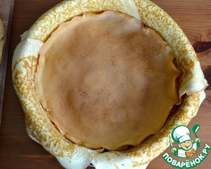 На дно формы (диаметром 26 см) положить пекарскую бумагу. Выложить оставшиеся 4 блина таким образом, чтобы они закрыли всю площадь и их края свисали за бортики формы. В центре при помощи формочки с острыми краями вырезать круг.