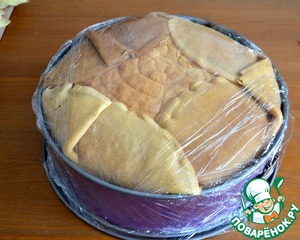 Перед подачей на стол переложить торт на 1.5 часа в холодильник. И непосредственно перед сервировкой достать торт, развернуть пищевую пленку, перевернуть на сервировочное блюдо. Снять бортики, дно и убрать пищевую пленку.