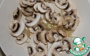 Шампиньоны режем вдоль на 3-4 части и отправляем к луку. Обжариваем на сильном огне, постоянно помешивая. Нам нужно обжарить грибы минут 7-10 так, чтобы они не выделили сок и остались сочными.