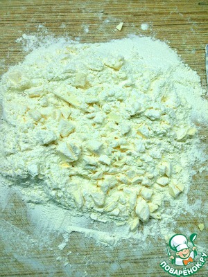Приготовим тесто. Для этого маргарин комнатной температуры порубить ножом с мукой в крошку.