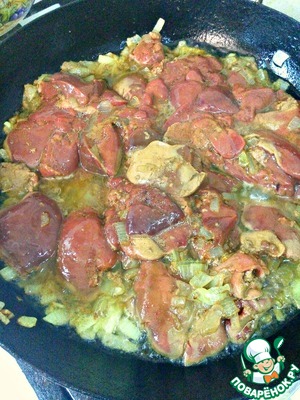 На лук всю перемолотую печень. Я на этом этапе прижимала начинку рукой, боялась, что заливка не влезет.