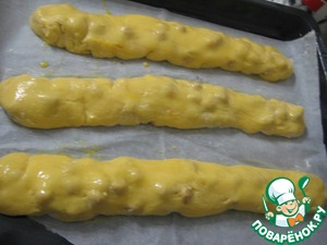 Выложить тесто на стол, присыпанный мукой. Тесто разделить на три части и скатать три "батончика" шириной 3- 3,5 см.
