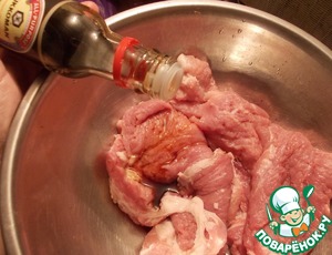 Полить мясо 3-мя ложками соевого соуса Киккоман и поперчить. Можно добавить любимые специи. Оставить мариновать минимум на час, а можно и дольше.