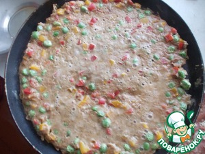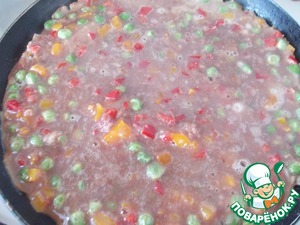 Добавим горошек и порезанный перчик. Он у меня был замороженный кубиком, поэтому и указан в столовых ложках. Перемешаем.