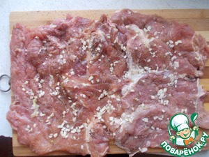 Тем временем мы займемся мясом. Оно полностью впитало соевый соус. Раскладываем ровненько на доску, чтобы потом было удобно его скрутить рулетом. Присыпьте мелко порезанным чесноком.
