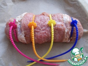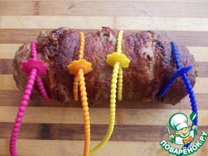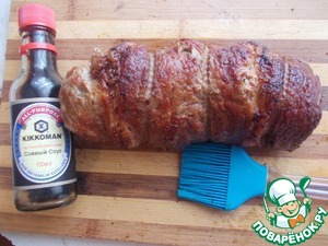Завязываем силиконово нитью, или другой, какая у вас есть. Смазываем соевым соусом сверху и отправляем в духовку 230С. на 40 минут, затем уменьшаем до 190-200С. и еще оставляем на 20 минут.