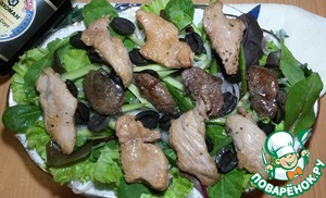 Сверху укладываем маслины и обжаренные с двух сторон на сильном огне грудку и печень.